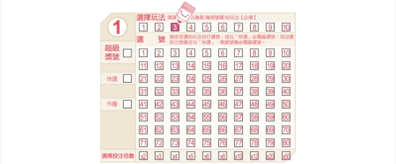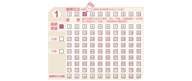 B. 超級獎號:先選擇十個基礎遊戲中的任一個,然後您可以選擇購買「超級獎號」遊戲。下圖中的例子是選擇3星遊戲,然後選擇購買「超級獎號」遊戲。只要您投注的號碼包含該時段開出的超級大獎號碼,您就可以兌換獎金。