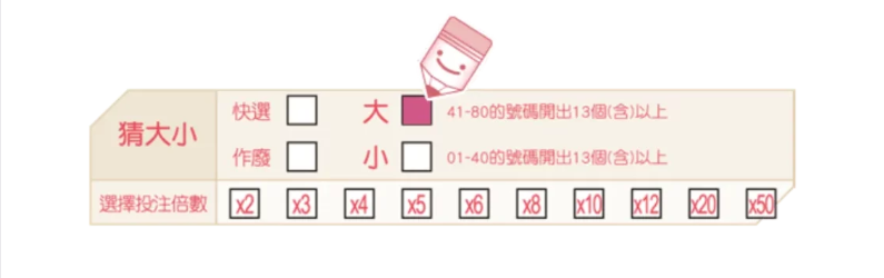 如果您認為41到80之間的號碼將等於或大於13,您可以選擇投注“猜大”