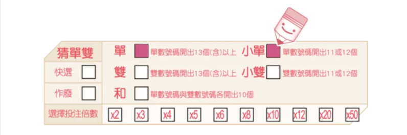 注意:同一個選號單可同時勾選多個開獎結果,下圖為購買「猜單雙」玩法,並同時選擇猜「單」及猜「小單」。
