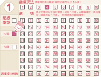 B.快選:在選號區中,劃記「快選」,投注機將根據您選擇的玩法,隨機產生一組號碼。例如:如果您在「玩法」欄中填選的是「4星」,且您劃記「快選」,投注機將為您隨機產生四個號碼。