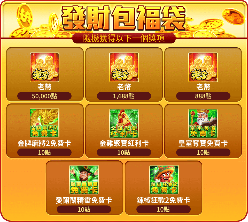 - - 福袋會直接進入我的寶箱,再次點選即可獲得虛寶卡或老幣。